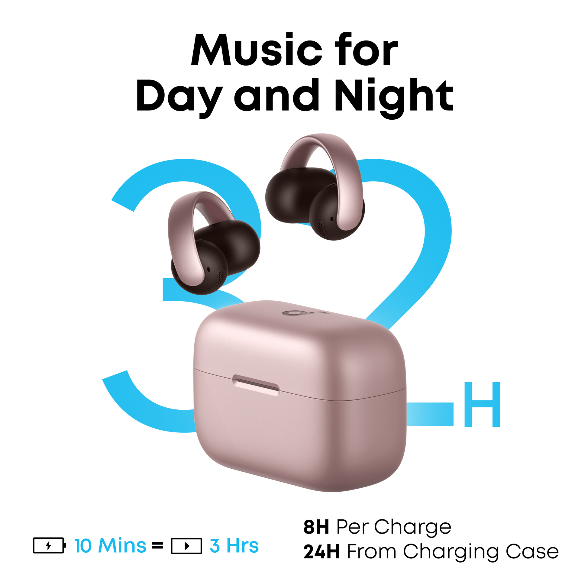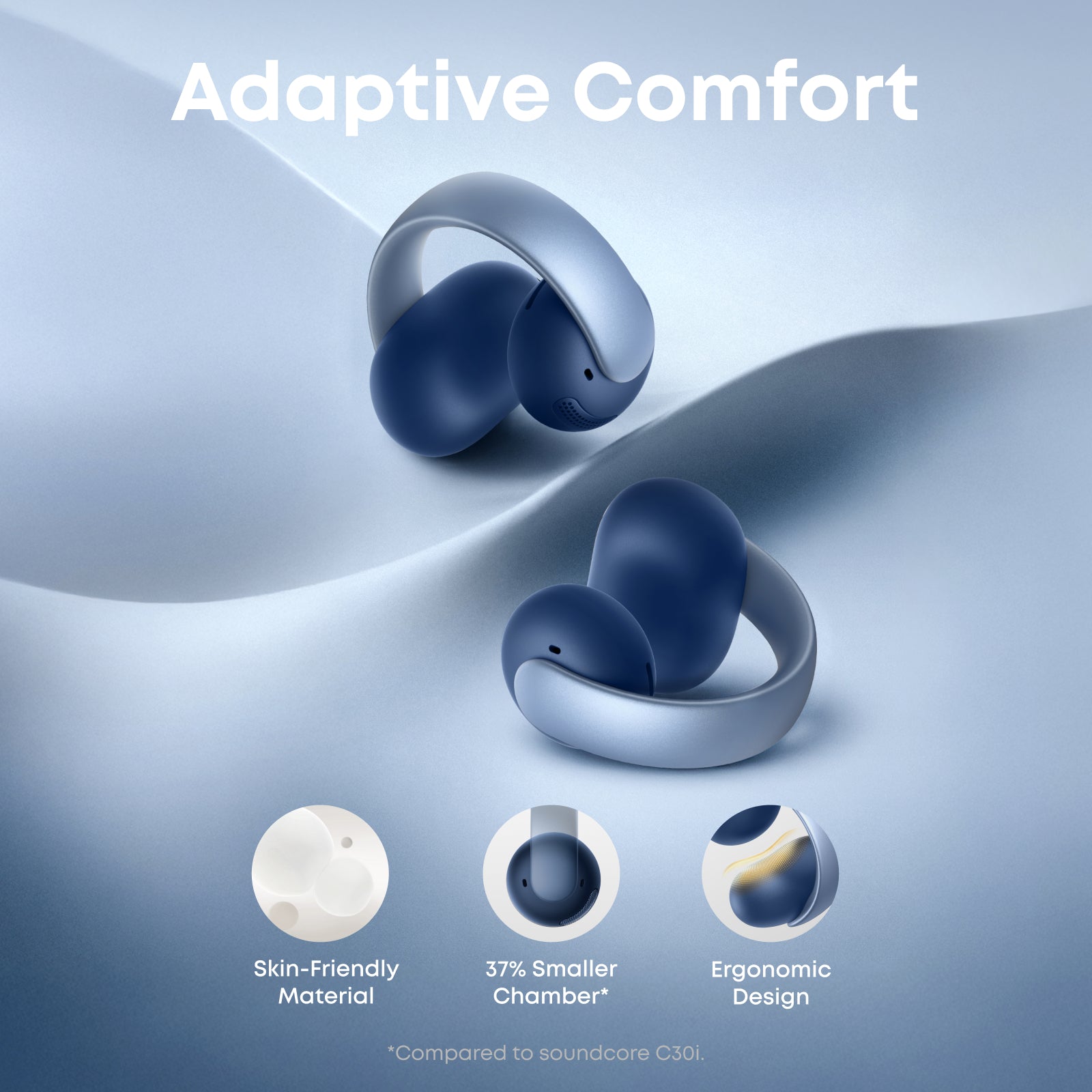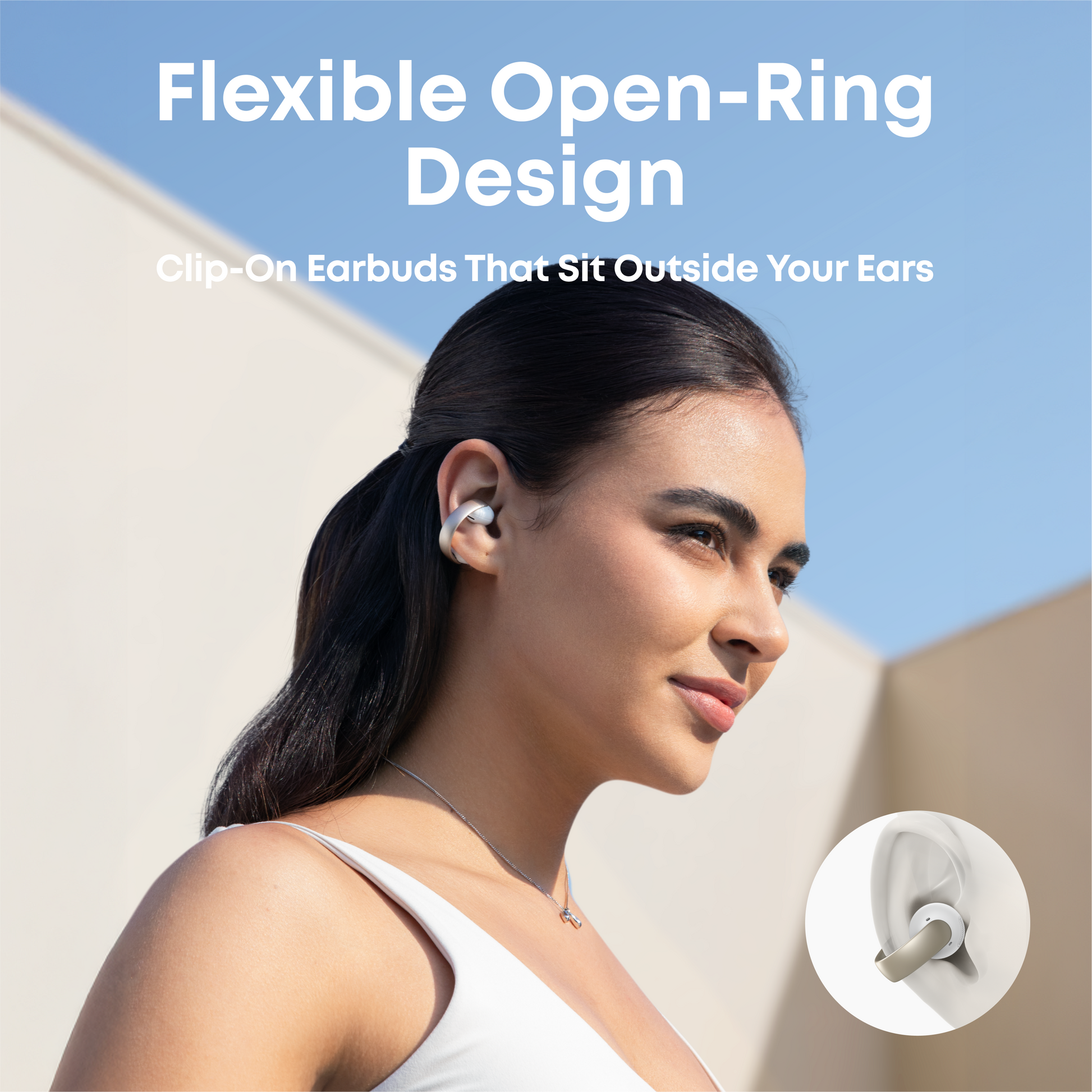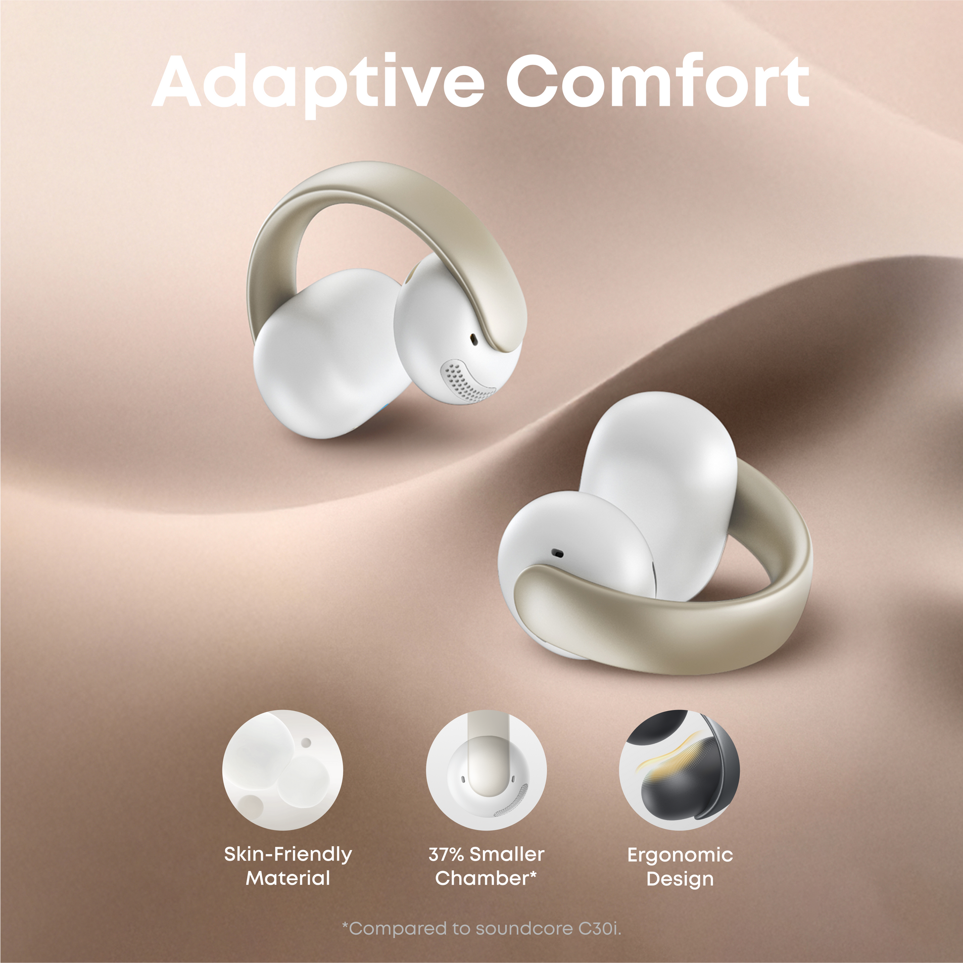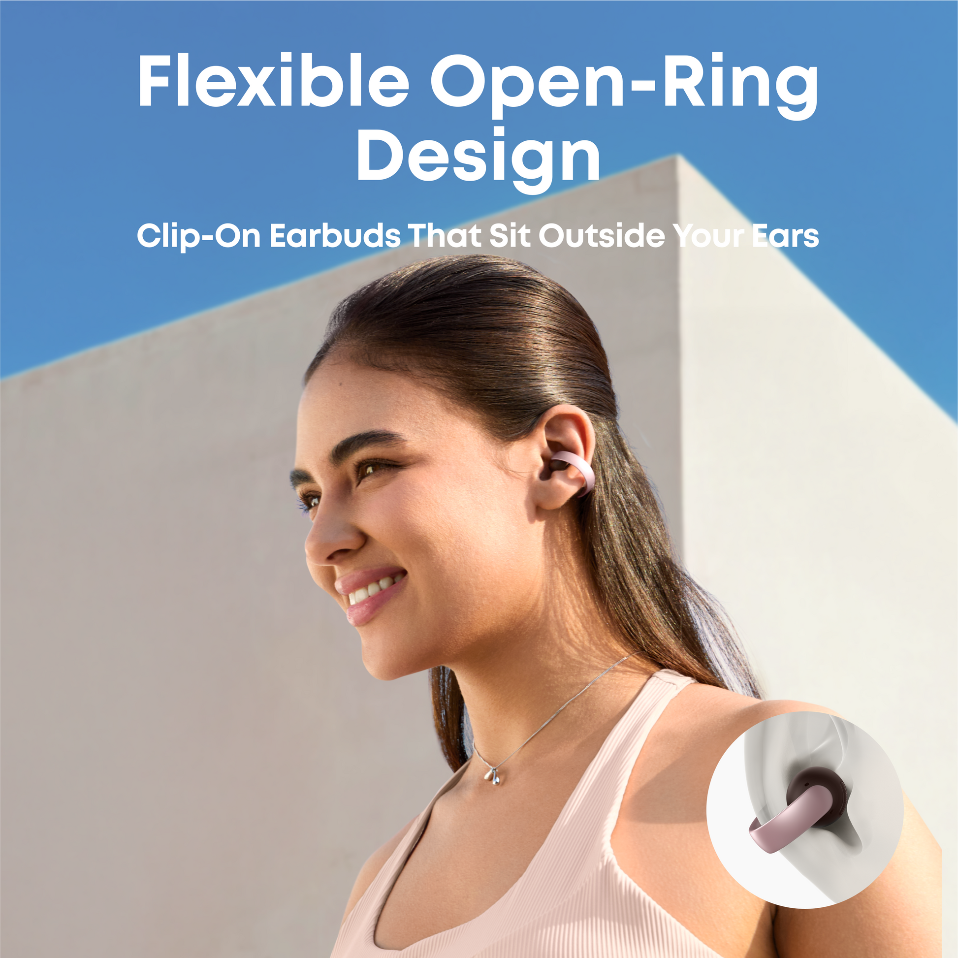 Flexible, Secure Fit: soundcore AeroClip clip-on earbuds boast an adaptive open-ring design that endures 20,000 bends. Featherlight and flexible, they stay secure for all-day wear.