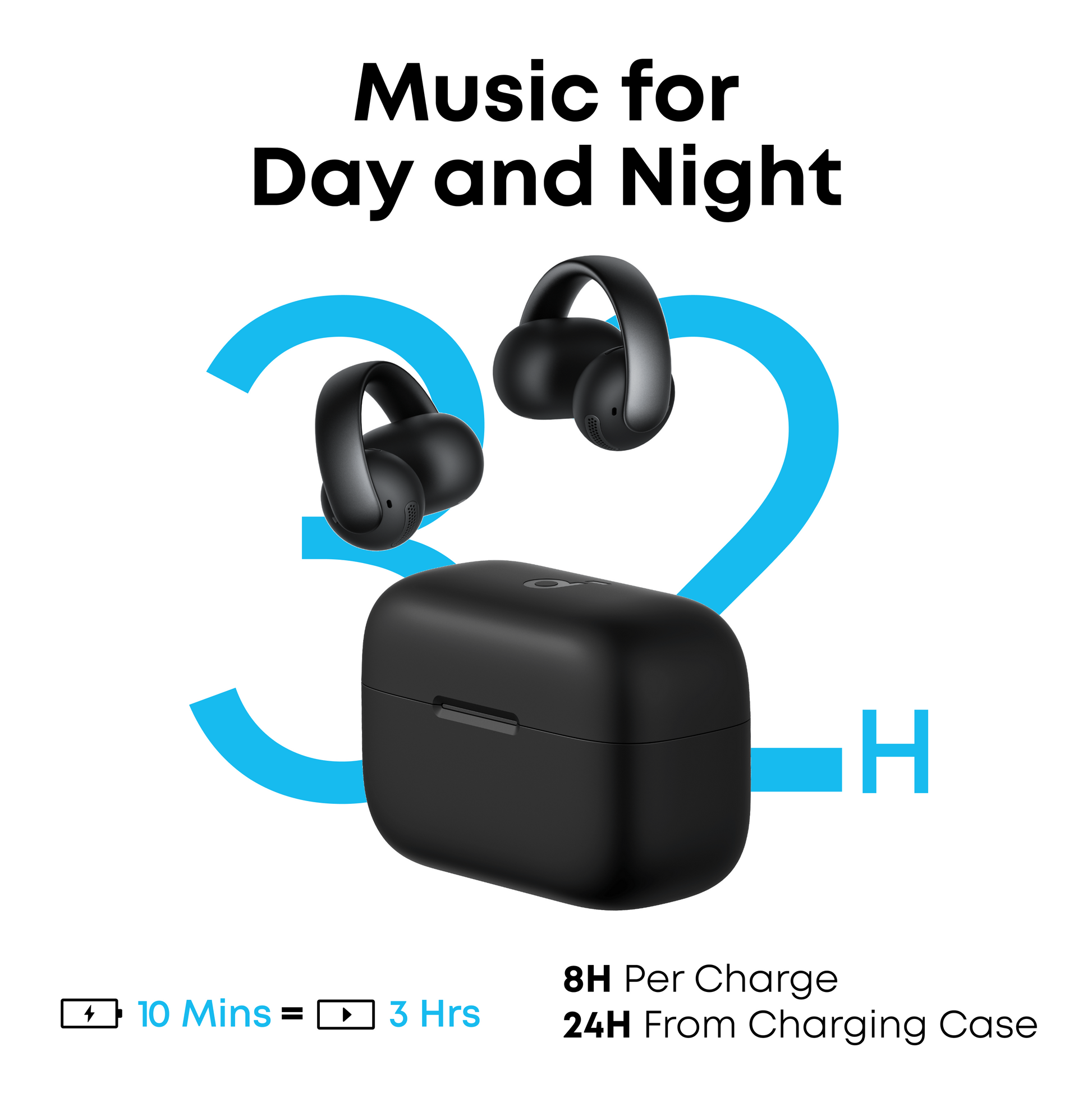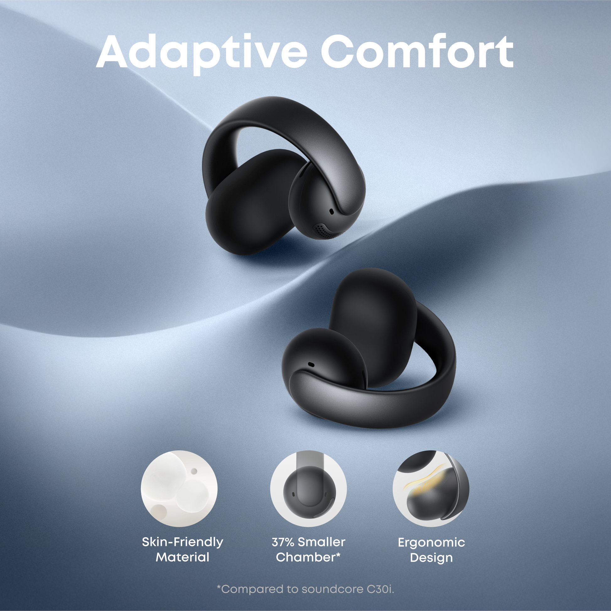 Flexible, Secure Fit: soundcore AeroClip clip-on earbuds boast an adaptive open-ring design that endures 20,000 bends. Featherlight and flexible, they stay secure for all-day wear.