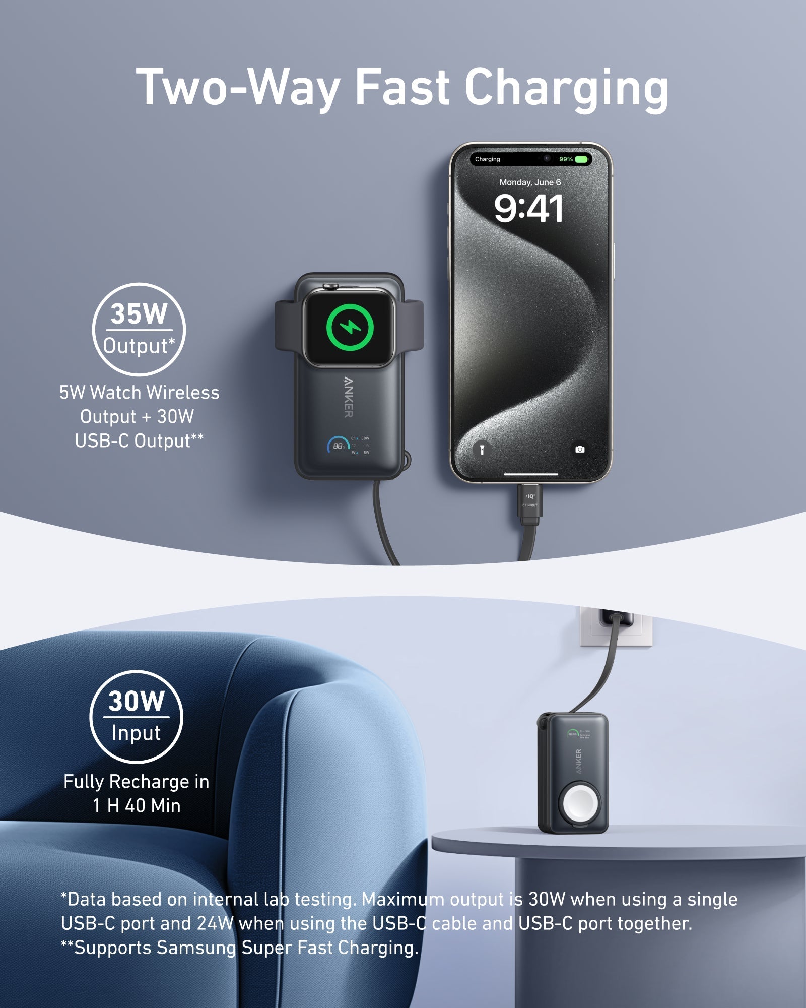 - 30W USB-C and 5W Apple Watch Charging: Supports simultaneous device charging with the built-in cable or port, offering up to 30W, alongside a wireless watch charger that provides up to 5W. The power bank fully recharges in 1.5 hours with a 30W maximum input.